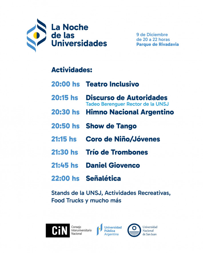 La Universidad Nacional de San Juan invita a toda la comunidad universitaria y al público en general a participar del Acto de presentación de “La Noche de las Universidades”, un evento federal impulsado por el Consejo Interuniversitario Nacional (CIN) y la Universidad Pública Argentina, que celebra el valor social de la educación superior pública.