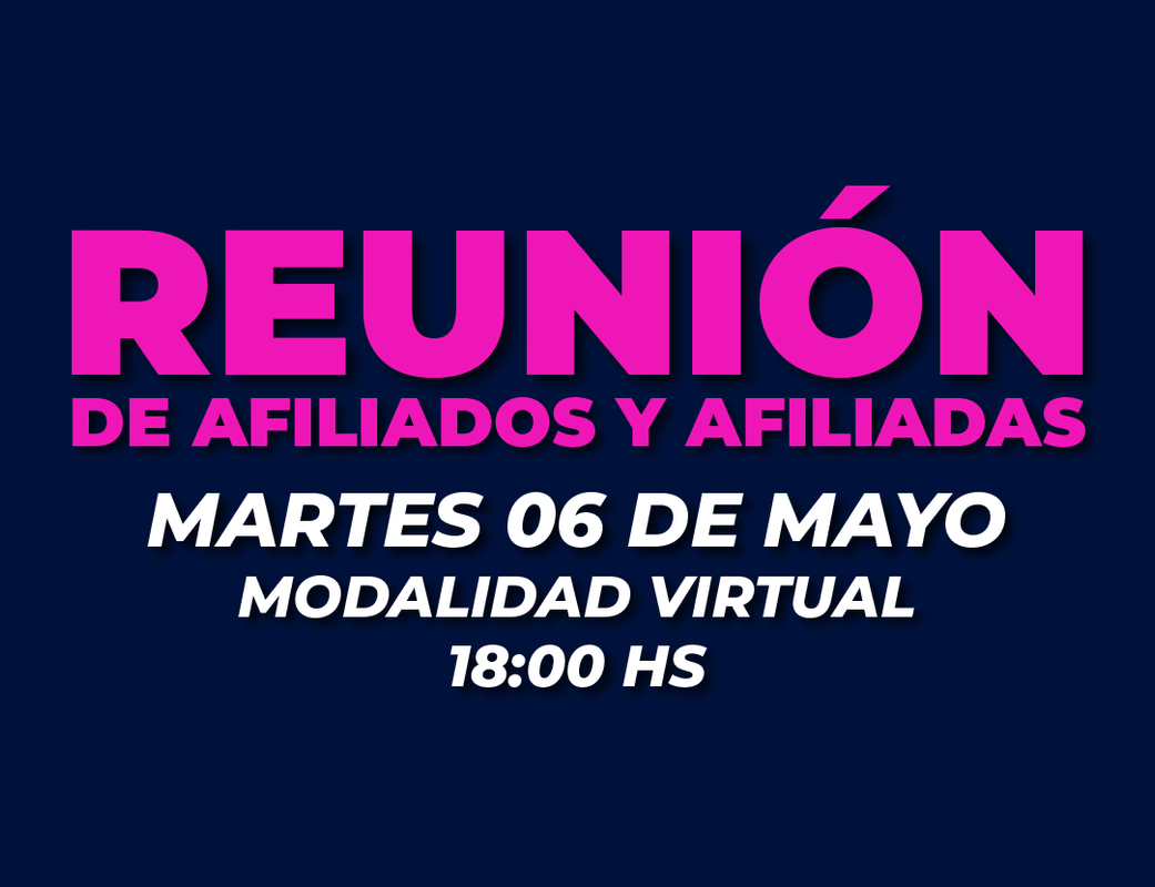 Convocamos a una reunión de afiliados y afiliadas para el día martes 06 de mayo, a las 18 horas, con modalidad virtual a través Google Meet. Más info acá