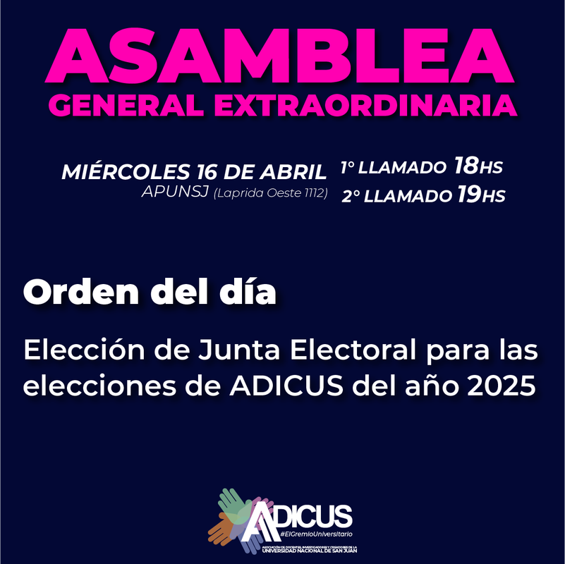 La comisión directiva de ADICUS, convoca a Asamblea General Extraordinaria para el día Miércoles 16 de abril en APUNSJ.