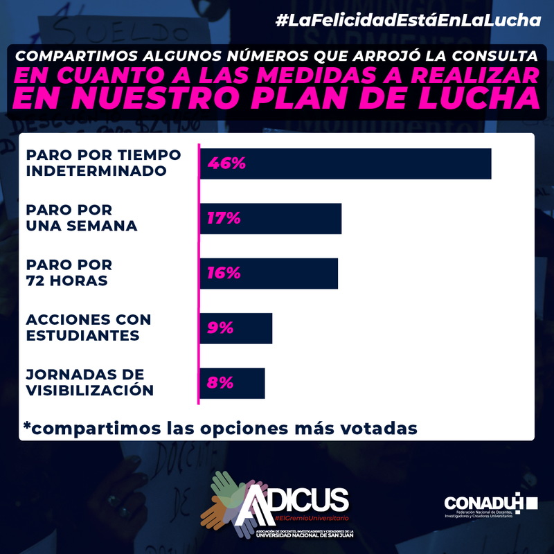 Por otra parte, en lo que respecta al Plan de Lucha, más del 45% de los y las participantes consideran que la próxima medida de fuerza debe ser un Paro por tiempo indeterminado, el 17% cree pertinente ir al paro por una semana, el 16% se inclina por un paro de 72 horas, mientras que un 9% opina que se deberían llevar adelante acciones conjuntas con las y los estudiantes y, por último, un 8% entiende que lo más apropiado sería realizar jornadas de visibilización.