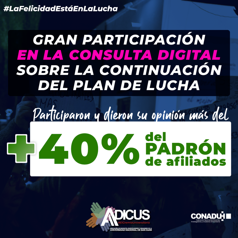 Nos complace informar a toda la comunidad que participaron de la consulta más del 40% de nuestros afiliados y afiladas, lo que constituye un gran aporte para que, entre todos y todas, podamos llevar a nuestra Federación CONADU Histórica una posición respaldada por un amplio sector de la docencia universitaria y preuniversitaria de San Juan.