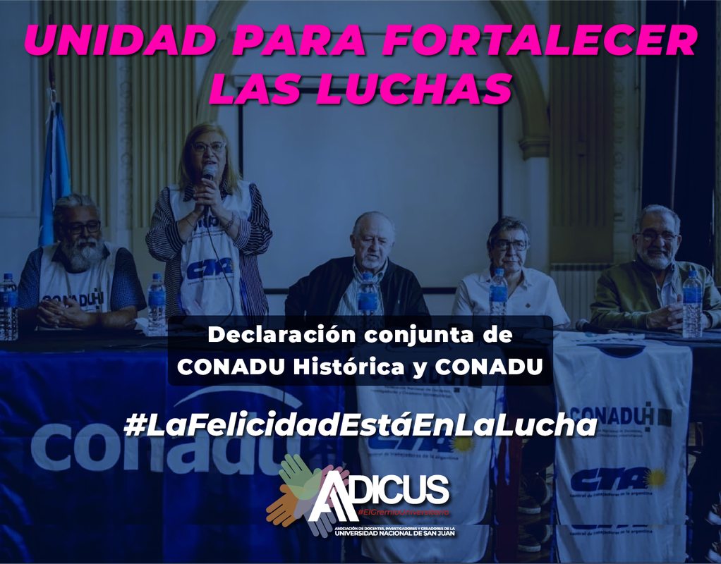 Esta reunión plenaria de las Mesas Ejecutivas, Secretarias y Secretarios Generales de las dos Federaciones, que representamos en conjunto a casi el 90% de la docencia universitaria y preuniversitaria sindicalizada en Argentina, reafirma las acciones gremiales que en esta etapa venimos transitando con mucha determinación. Sabemos que esto es oportuno y necesario, en la senda que ha sido planteada por la CTA Autónoma y la CTA de Trabajadoras y Trabajadores. CONADU y CONADU Histórica nos proponemos consolidar este rumbo de unidad, con iniciativa política, en la convicción de que el momento histórico demanda de nuestras organizaciones la decisión de comprometerse en la construcción de horizontes que fortalezcan al movimiento popular, en la resistencia al proyecto de saqueo, hambre y destrucción que representa el gobierno de Milei y sus aliados, pero también para generar condiciones que nos permitan encontrar colectivamente un camino superador de nuestras penurias.