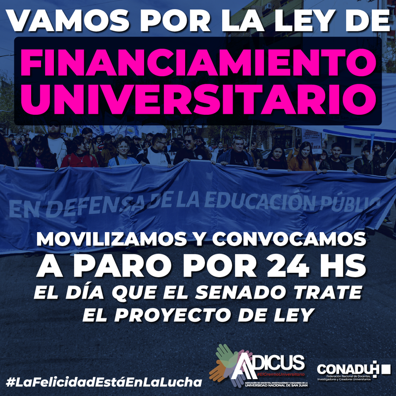 Se ratificó también la convocatoria a concentrar en la Plaza de los dos Congresos el día que se dé tratamiento a la ley (probablemente el 5 de septiembre) y acompañar en todo el país con un paro de 24 horas. CONADU Histórica entiende que esta ley es producto de la lucha en defensa de la Universidad Pública y el salario de sus trabajadores/as.