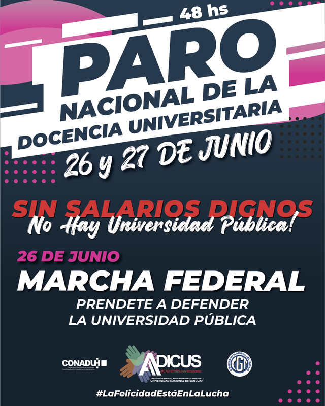 Los días 26 y 27 de junio se llevará adelante un nuevo paro nacional docente universitario de 48 horas en reclamo de la urgente actualización salarial, ante la persistente falta de respuestas por parte del Gobierno nacional, que continúa clausurando la discusión paritaria.