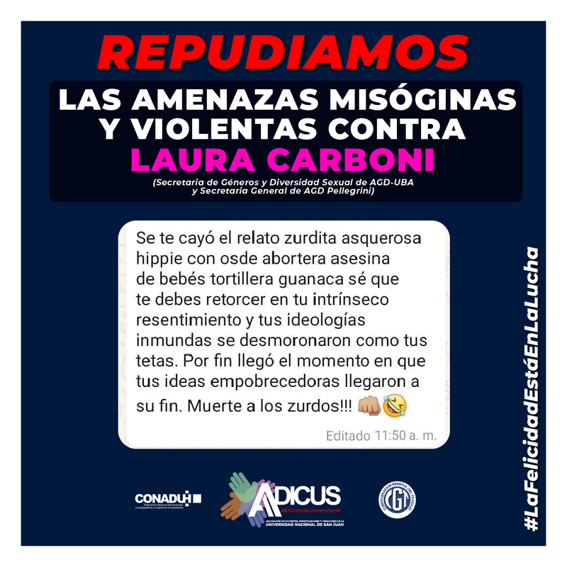 Desde ADICUS nos solidarizamos con la compañera Laura Carboni – Secretaria de Géneros y Diversidad Sexual de AGD-UBA, asociación de base de CONADU Histórica – quien recibió el 4 de enero en su WhatsApp personal un mensaje insultante, injurioso y amenazante.